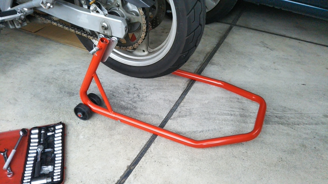 スタンドをスイングアームの後部に差し入れ、テコの原理でグイっと持ち上げればクルクルと後輪が回し放題、楽々チェーンをスライドできます。