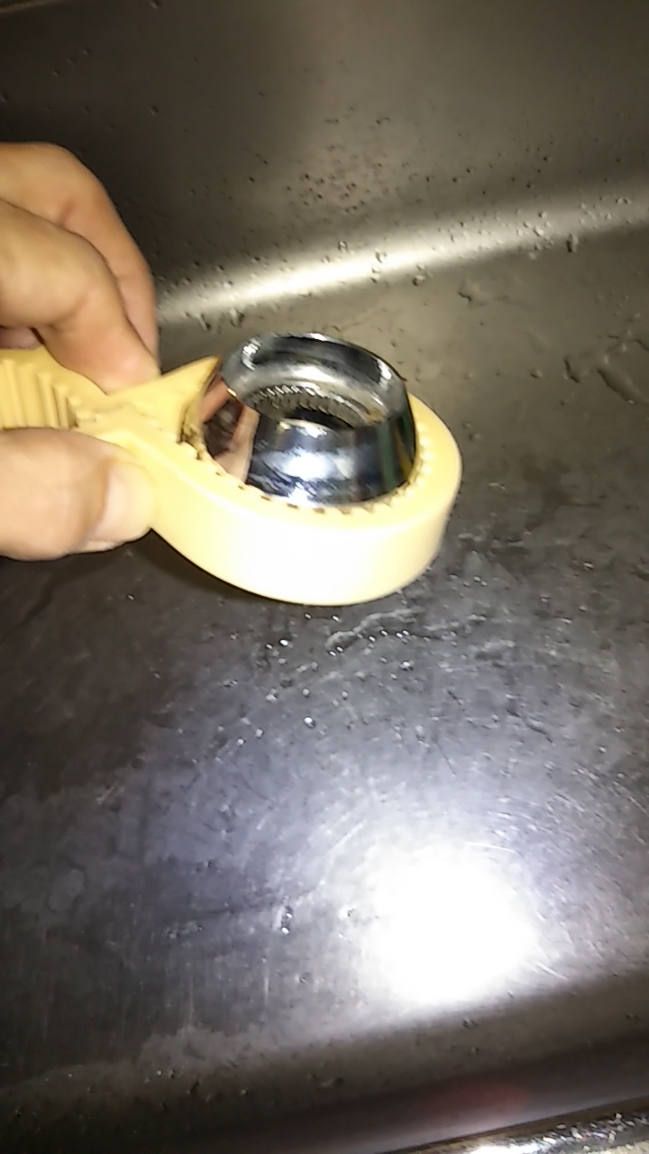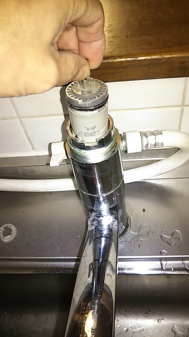 作業開始です!水栓レバーを上に引っ張って抜きます。そうするともうカートリッジの頭が見えます。上部に付いているストッパーの歯車を抜き、カートリッジカバーを回せばいいのですが、んー、???全然回りません!!