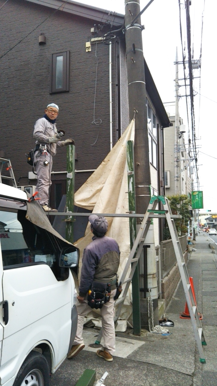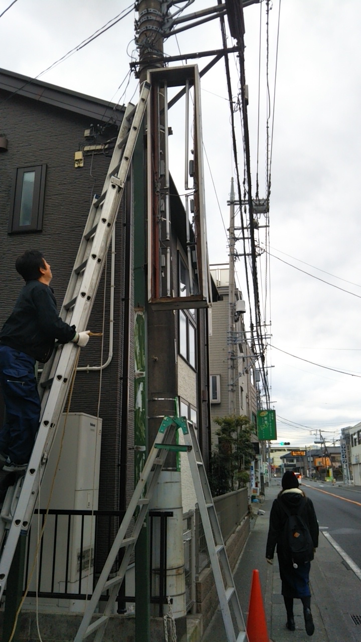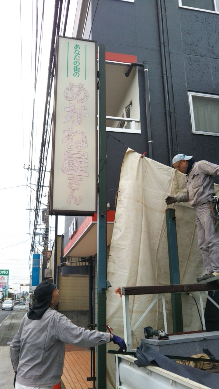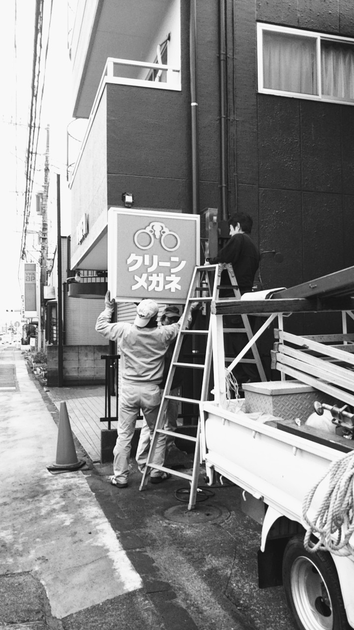 そして余分な鉄骨をカットした後に新しい看板をセット!
