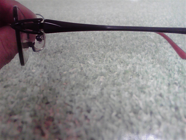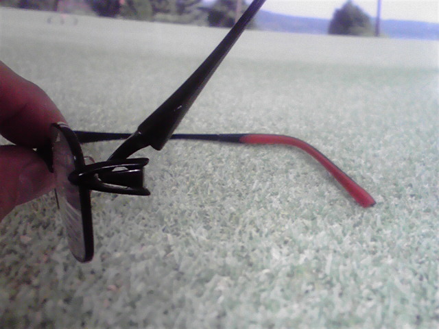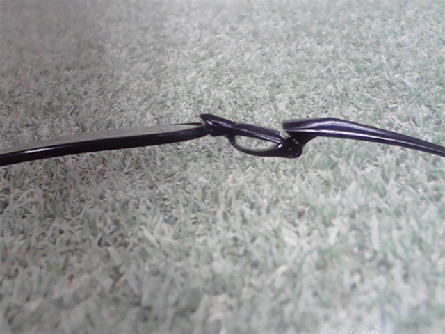 右の写真は反対側の右テンプルを上から見ると、90°に曲がるフロントとの接合部分が180°に真横に開いてしまっています。