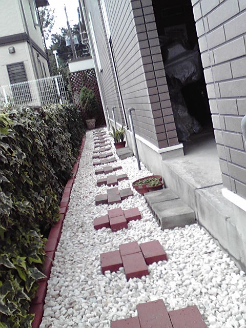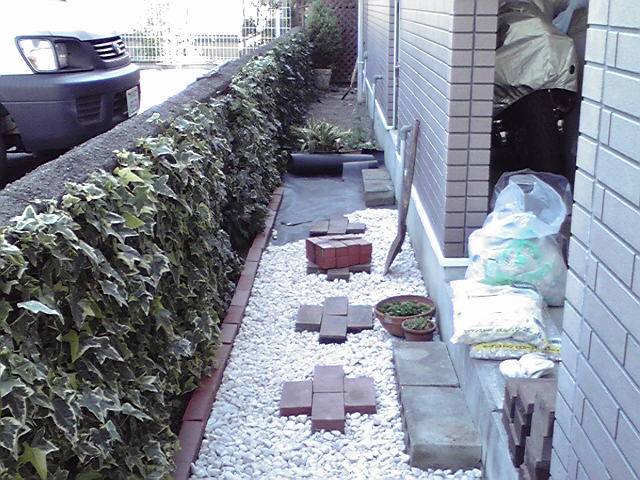 玉砂利、防草シート、レンガを経過をみながらその都度追加し、結局ホームセンターを3往復するはめに。