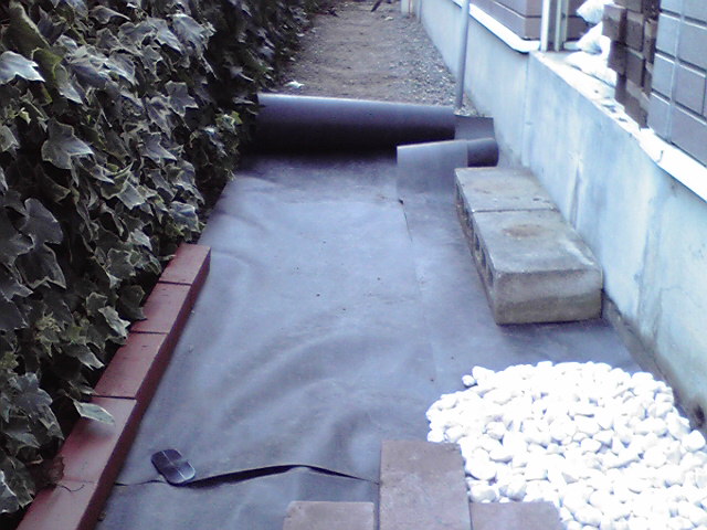 ホームセンターで玉砂利の10キロ入り20袋と防草シート10ⅿ、レンガ数十個を買い早速作業の続きです。かなり暑い時期なので、休憩を挟みながら進めます。