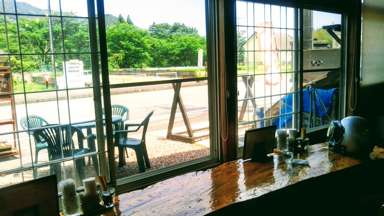 私のお気に入りの風が吹き抜ける窓際の席です。外の景色や通るクルマ、バイクが眺められる古木のカウンター席