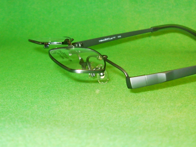 向かって左の写真のように一見すると普通のメガネのようですが、ワンタッチで右のようにレンズ部が跳ね上がります!
