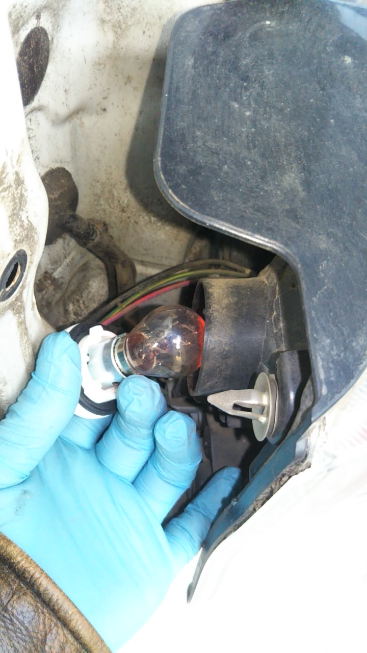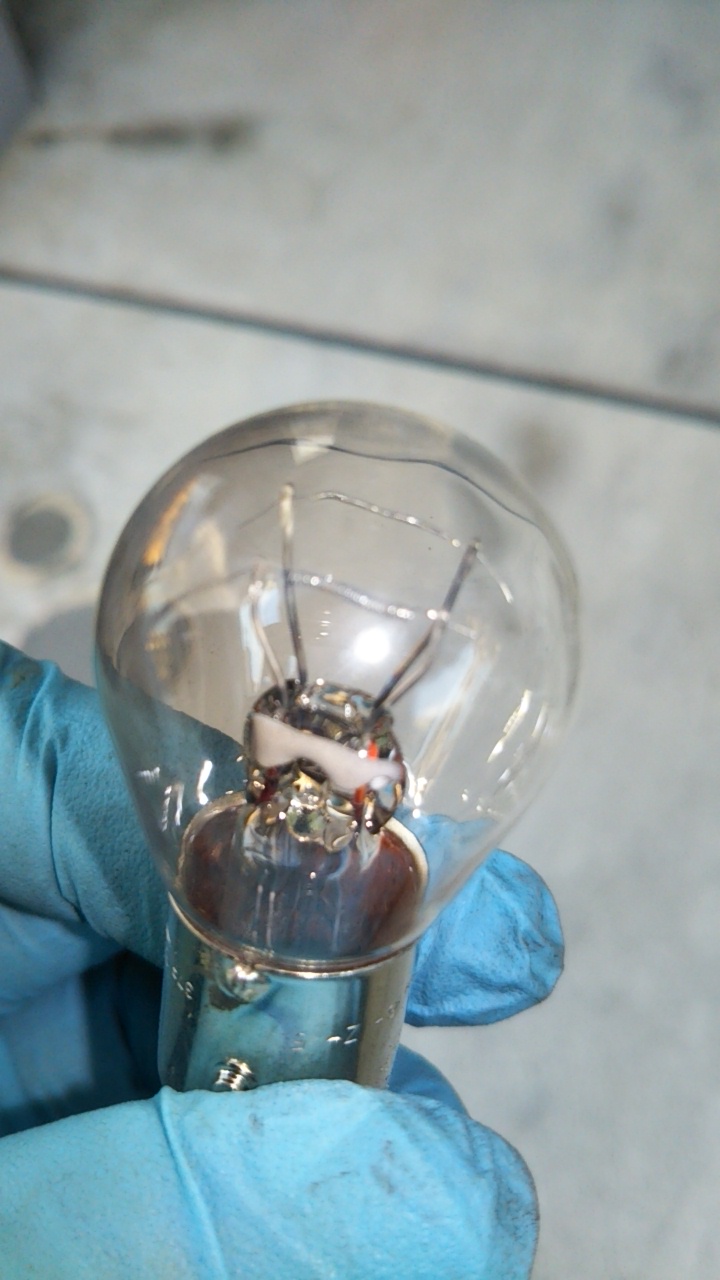 テールランプカバーを外し、バルブを外します、外したバルブを見ても切れた感じはしませんが、交換したらバッチリ点灯しました。