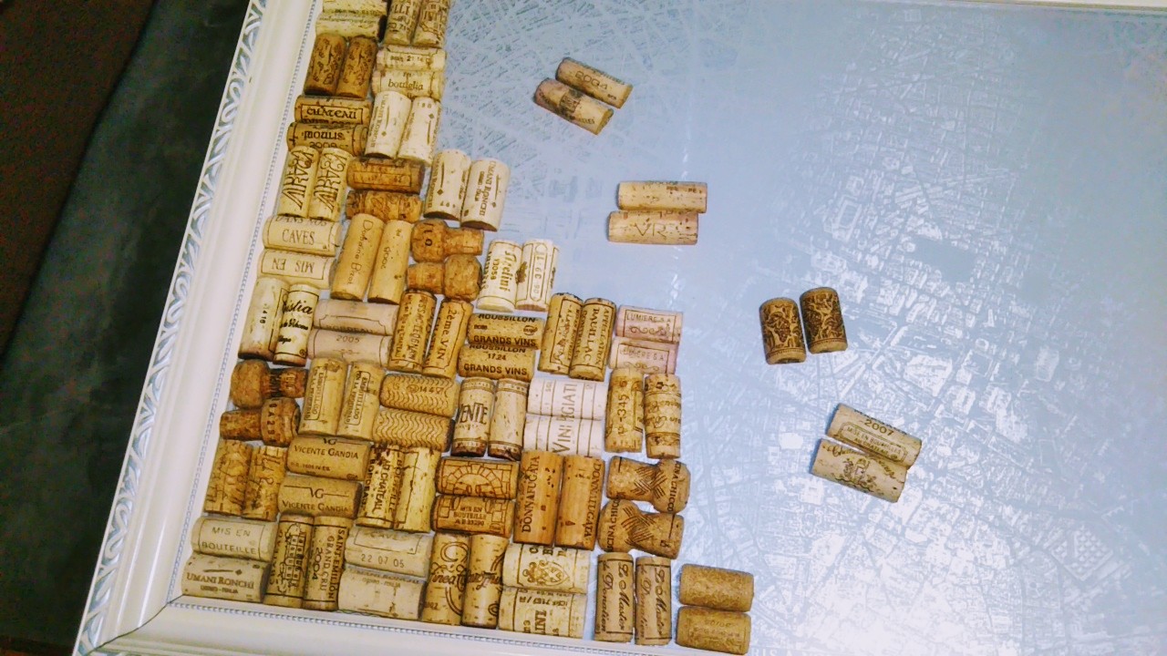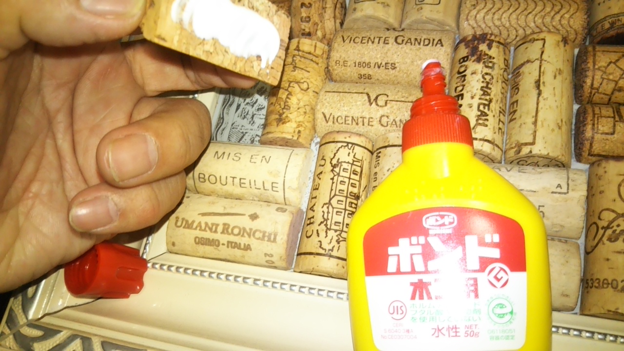 さぁ、時間はたっぷりあります、今まで飲んだワインのコルクが山のようにありますので半分に切って額に貼っていきましょう!