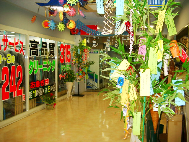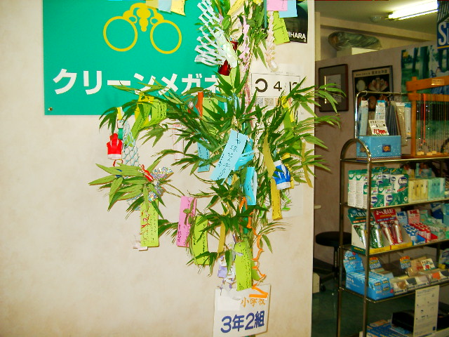 写真をクリックすると大きくなります毎年恒例のショッピングセンターの七夕の飾り付けに、近所の小学三年生が思い思いの願いを書いた短冊を手にみんなで取り付けのお手伝いにやってきました。